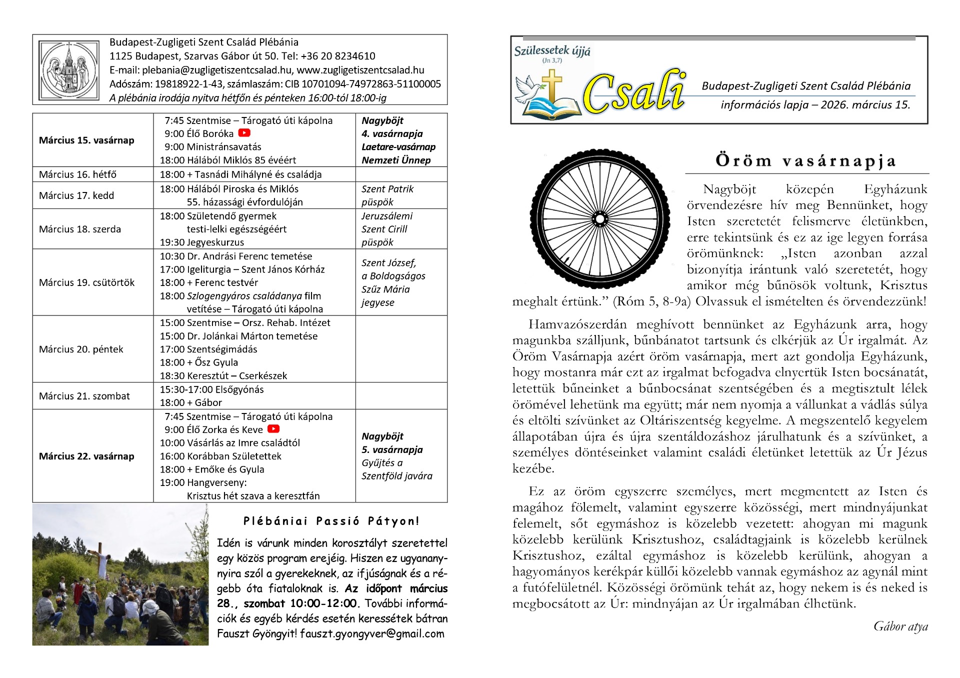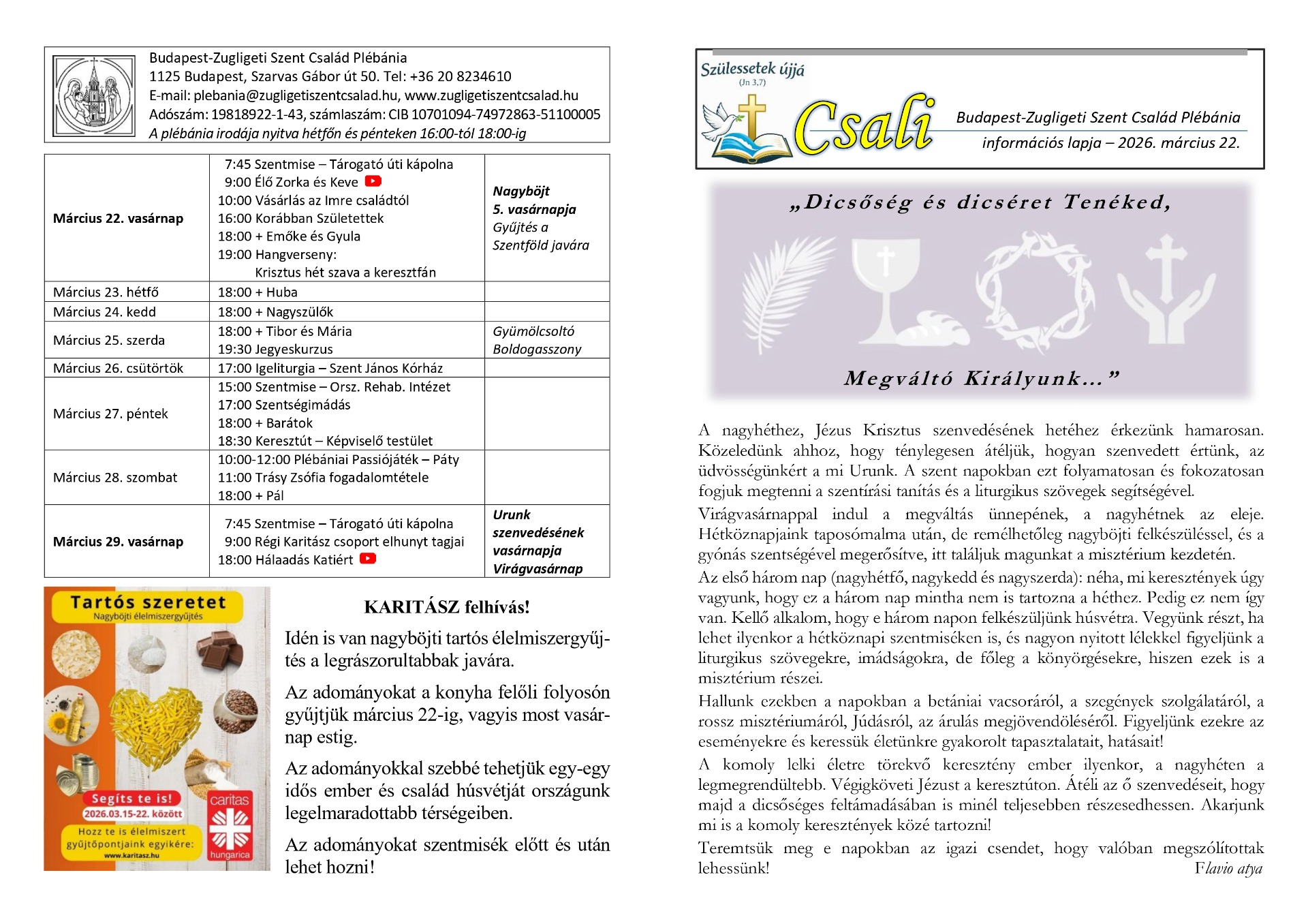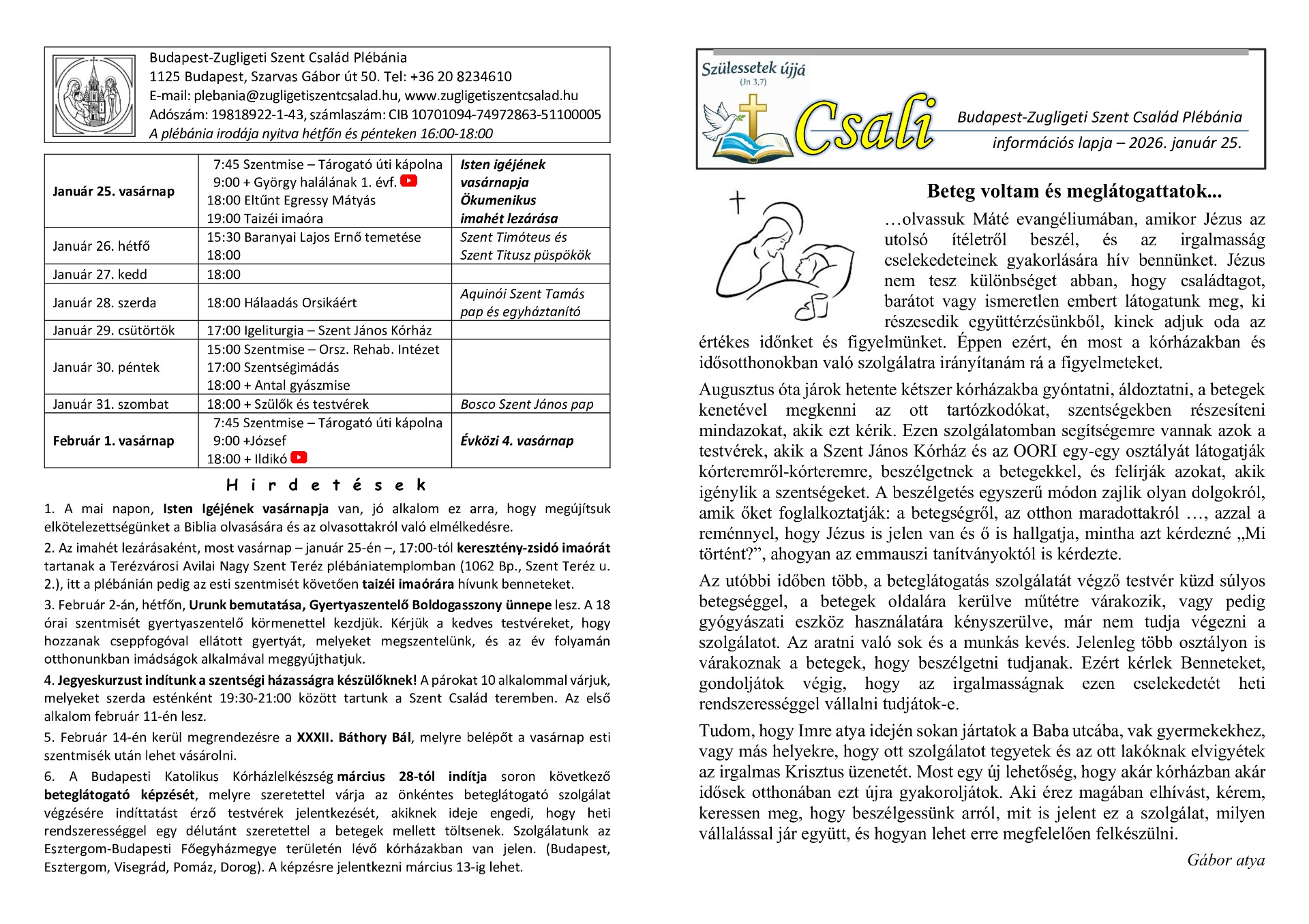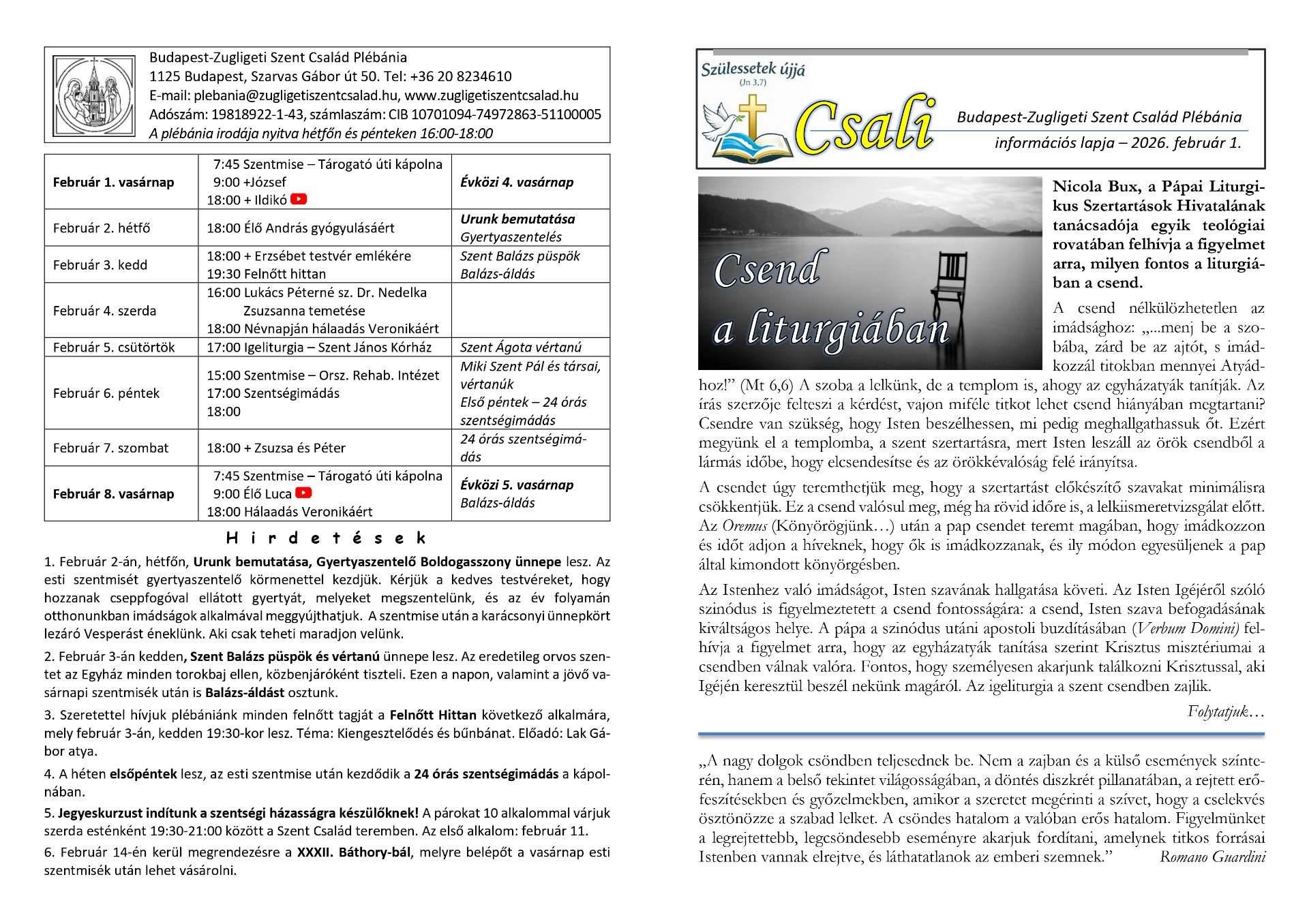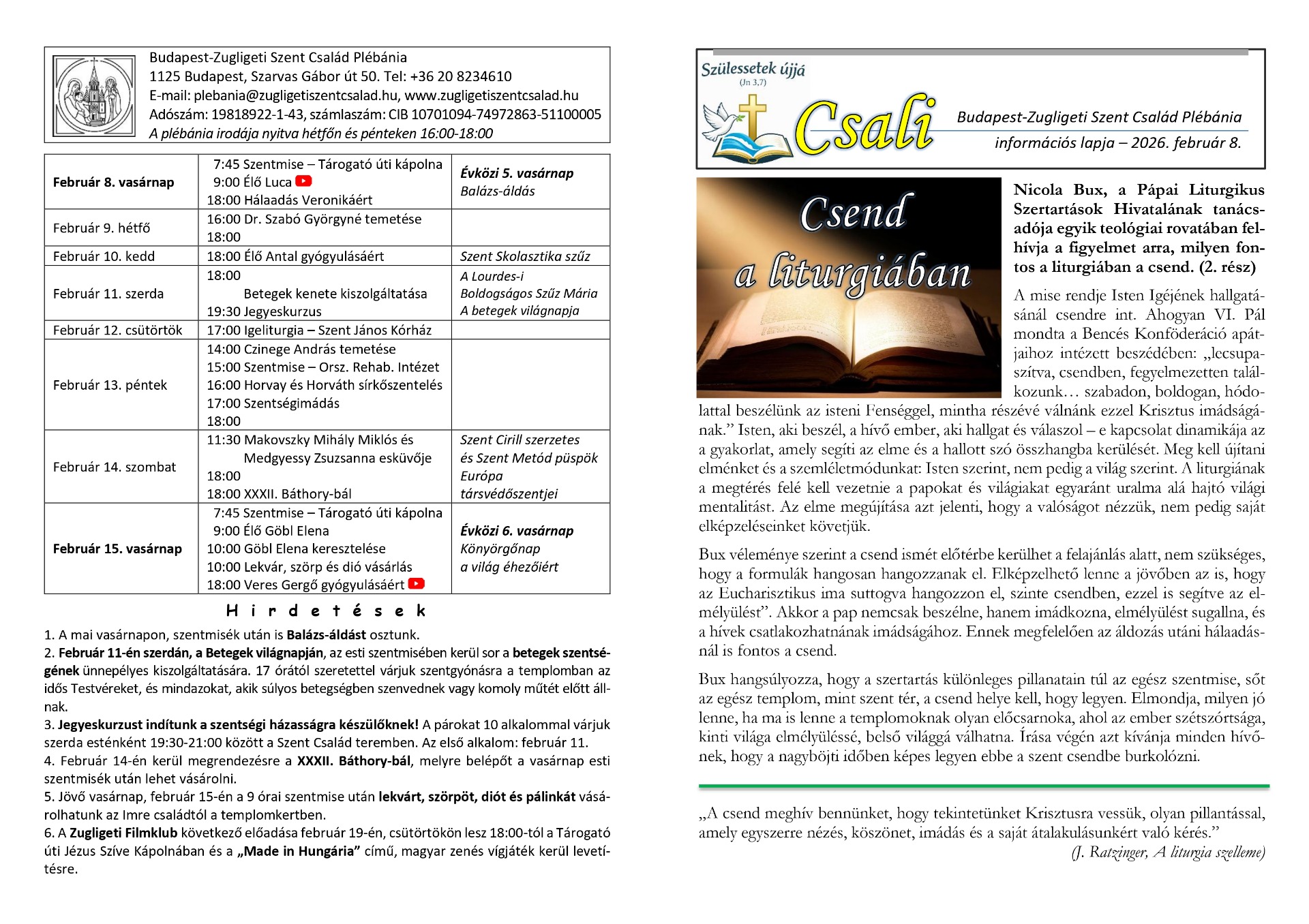 a Budapest-Zugligeti Szent Család Plébánia információs hetilapja